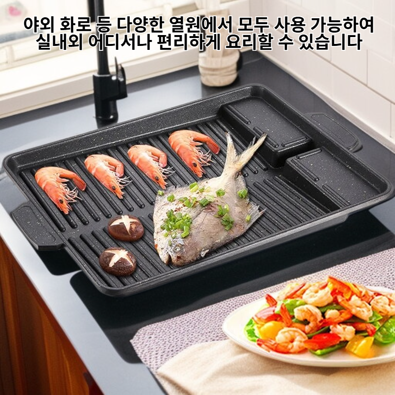 ● 프리미엄 마이판석 코팅으로 음식을 눌어붙지 않게 하여 세척이 간편하며, 오랜 시간 새것처럼 사용할 수 있습니다. ● 사각형 디자인으로 다양한 재료를 한 번에 넓게 구울 수 있어 가족 또는 친구와의 홈파티, 야외 바비큐에 최적화된 제품입니다. ● 인덕션, 가스레인지, 야외 화로 등 다양한 열원에서 모두 사용 가능하여 실내외 어디서나 편리하게 요리할 수 있습니다. ● 인체에 무해한 논스틱 코팅을 사용하여 건강을 생각하는 분들에게 안심하고 추천드리는 안전한 그릴팬입니다.